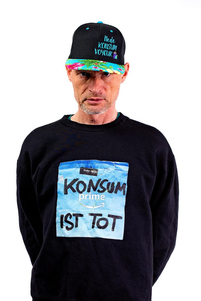 NEDE X ATTIC.STUDIO „Verwandlung des Konsums“ Konsum ist kein Endpunkt, sondern Material. Aus gebrauchten Kleidungsstücken formuliere ich neue Bedeutungen, indem ich sie durch mein künstlerisches Signet transformiere. So entlarve ich Überfluss und zeige, wie Nachhaltigkeit als kreative Praxis funktioniert. Aus Alltagskleidung wird Kunst, aus Konsum eine kollektive Erinnerung, aus meinem Logo eine Botschaft.Black Friday Deal NEDE Sweater „Konsum ist Tot“ & Snapback Cap „Konsumvoyeur“ Foto: Richard Byrdy